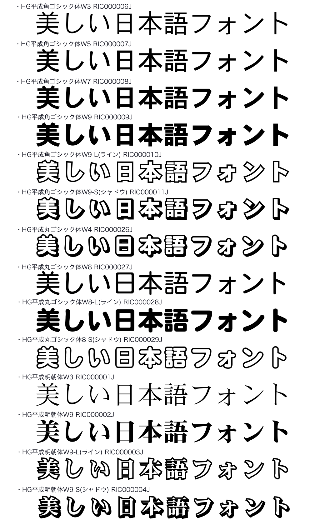 文字ピッチや半角文字のデザインが異なる、HG~・HGP~・HGS~の3フォントを収容。こちらはJIS2004字形のフォントです。商用ライセンスつき価格です。